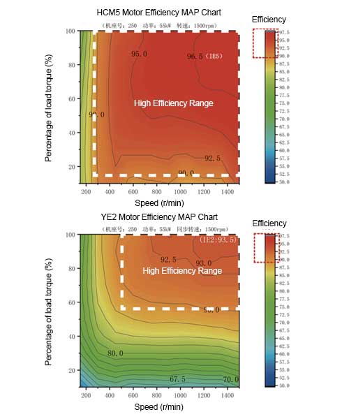 High efficiency region: HCM5 motors have a wider range of high efficiency region and higher efficiency (95.0%-96.5%), while YE2 motors have a relatively narrow high efficiency region and a slightly lower efficiency range (92.5%-93.0%).