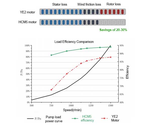 Under the condition of high speed of pump load, the efficiency of HCM5 reluctance motor is higher, the efficiency is more than 90%; while the efficiency of YE2 asynchronous motor is slightly lower, between 85% and 90%.